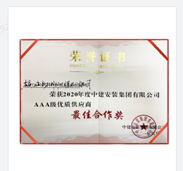 左成(上海)新材料科技發(fā)展股份有限公司在2020年供應(yīng)商評(píng)選中,獲得“中建安裝集團(tuán)有限公司AAA級(jí)優(yōu)質(zhì)資源供應(yīng)商”最佳合作的獎(jiǎng)項(xiàng)。